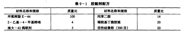 ④按上表胶黏剂配方称量、搅匀。在粘接面涂胶,对合挤紧加压。